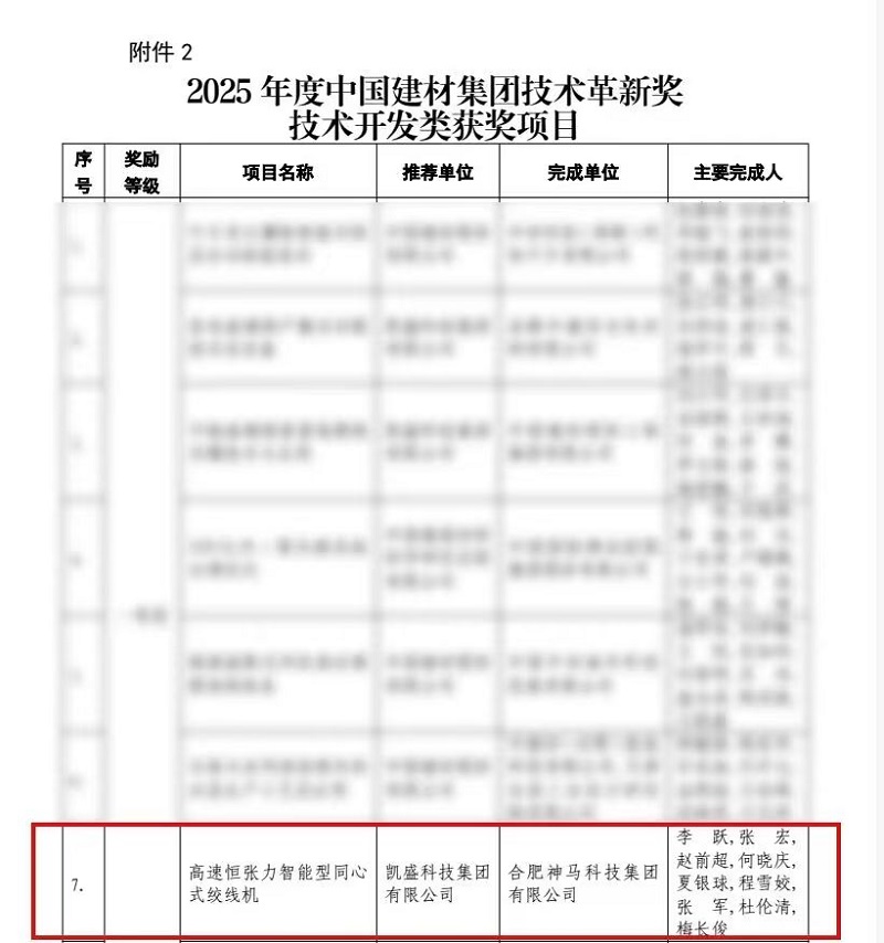 近日,中国建材集团发布《关于表彰2025年度“国际工程杯”中国建材集团技术革新奖获奖成果的通知》,合肥神马申报的“高速恒张力智能型同心式绞线机” 项目荣获技术开发类一等奖。